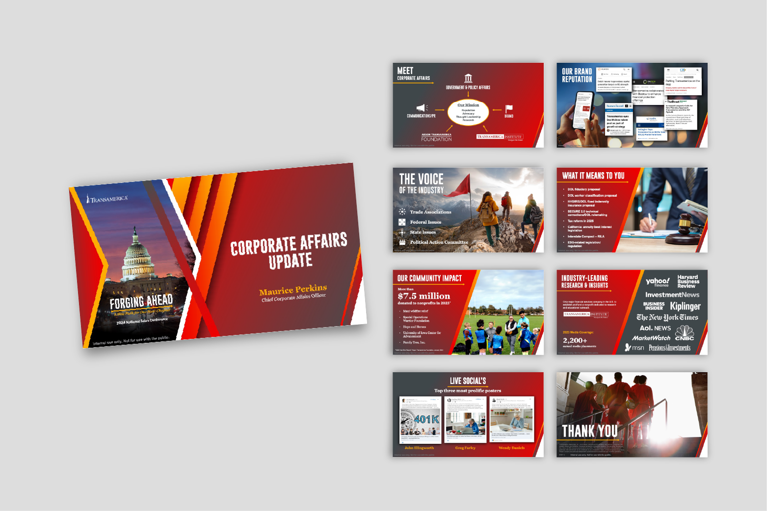 Slides used for a conference session presented by the chief corporate affairs officer.