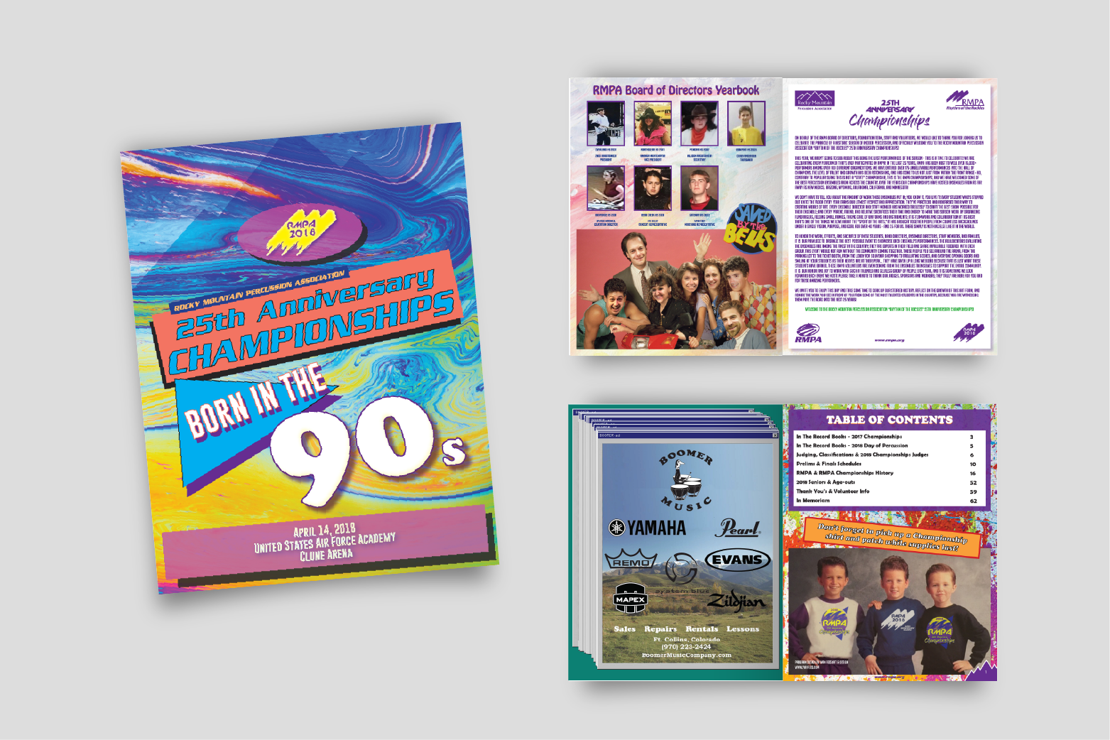 68-page Championship event program. This commemorative program recaps 25 years of the indoor percussion activity with photos, historical data, and design aesthetics that are a blast from the past and travel through time along with the circuit history.